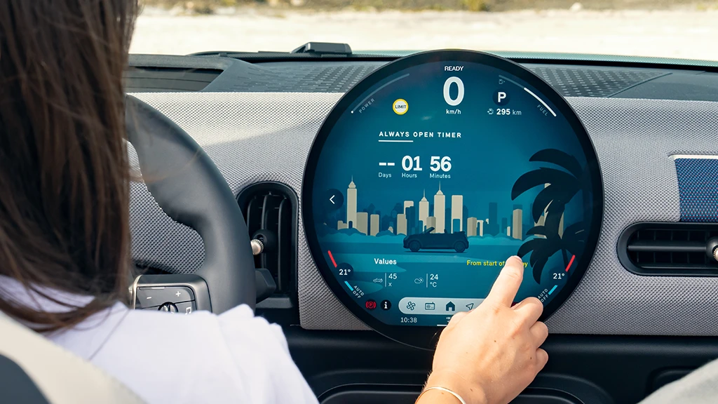 L’écran central iconique de 240 mm de diamètre avec son verre haute qualité est votre tableau de bord et votre centre info-divertissement et d’assistance à bord. Il se trouve que c’est aussi le tout premier écran d’affichage circulaire jamais créé.